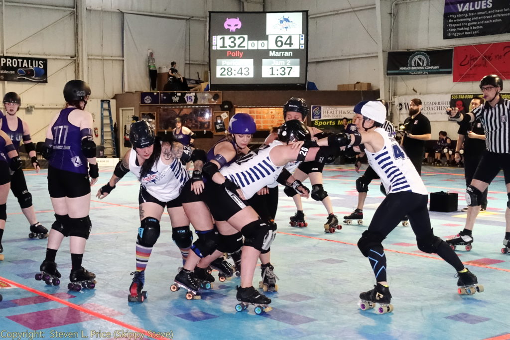 The Axles of Annihilation’s Polly Wanna Crack’er works her way through a tripod of Dock City blockers at a private game between the two teams at The Hangar. (Photography Credit: Steven L. Price)