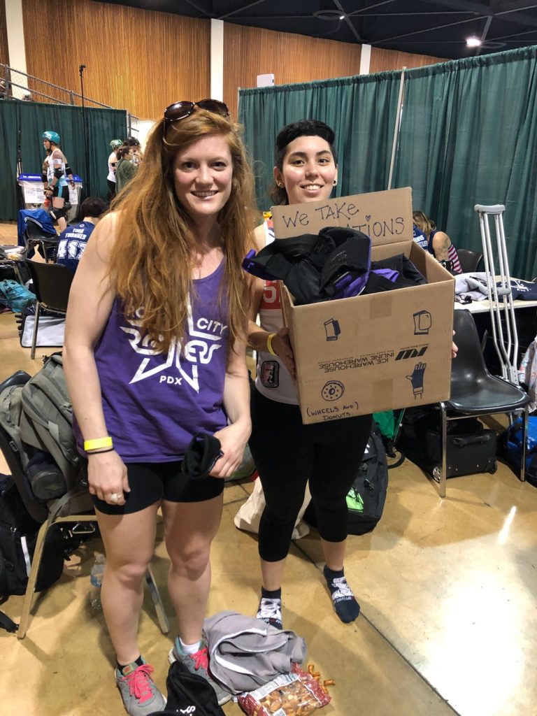 The bonds between Rose City and Sailor City didn’t stop in Eugene: several Rose City skaters hosted Sailor City skaters while they were in town and donated used gear to help their league, and the sport, grow in South America…and the donations continued when Sailor City joined Rose City for its closed-door Wednesday night scrimmage after the tournament.