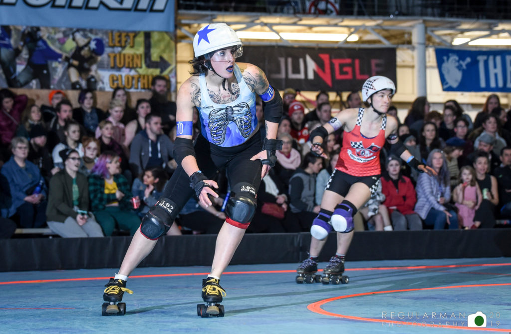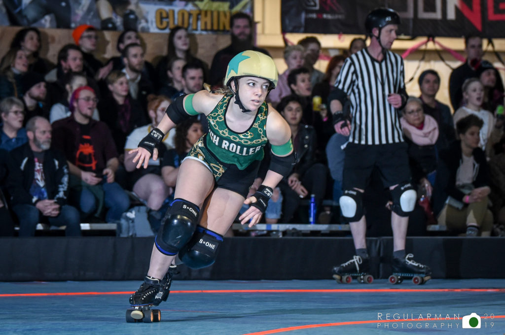 In the first bout of the season-opening home team double-header, High Rollers (HR) took their first win since 2017 against Guns N Rollers (GNR), a team that ended the 2018 season battling the Break Neck Betties for the home team championship. HR’s Polly Wanna Crack’er had a breakout performance with 86 points in the team’s 101-point win. HR’s off-season addition of Elicia Nisbet-Smith—co-captain of the world-champion Wheels of Justice and a mainstay of its blocker corps—helped shore up HR’s defense, which was able to limit last season’s top scorer, GNR’s Eve Anne Hellical, to 59 points.