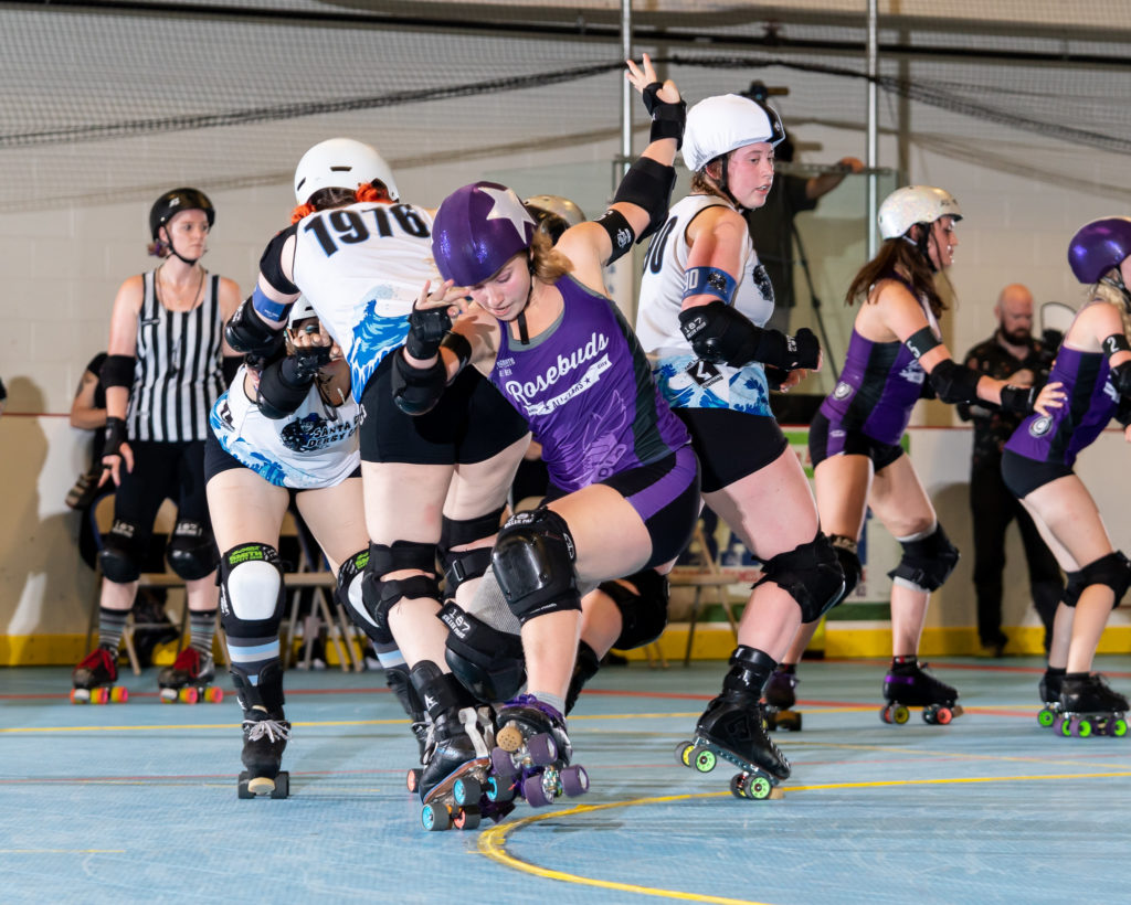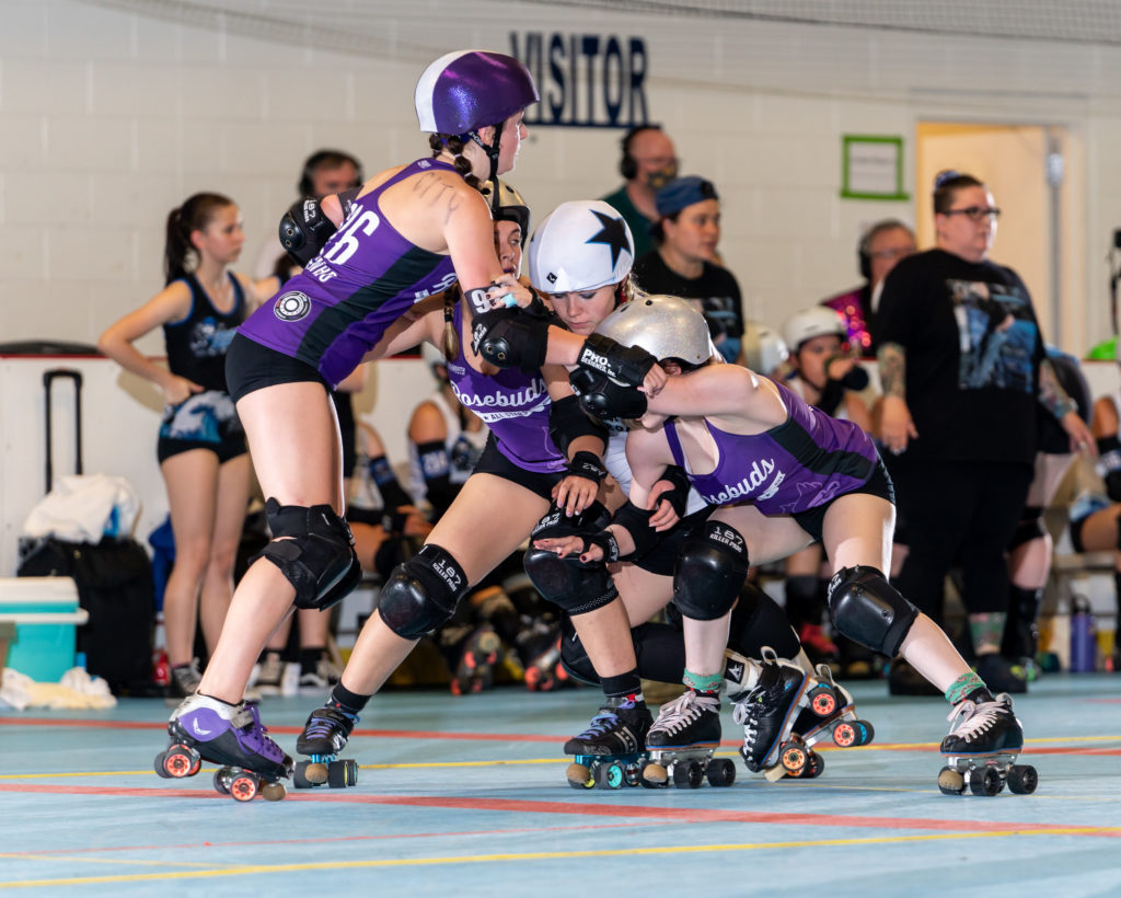 Rosebuds blockers play heavy defense on the opposing jammer. (Photography Credit: recess.photography)
