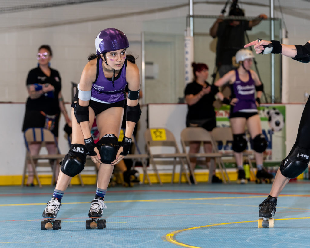 RCR’s Rosebuds knew they were going to have to bring their A-Game to the track; and The Grom’s were determined to ensure this win wasn’t a cakewalk. In the first half, there were numerous lead changes, often with one team scoring points unanswered for several jams, and vice versa. At the end of the first half the score remained a tight 79-70, with the Rosebuds holding a small lead.