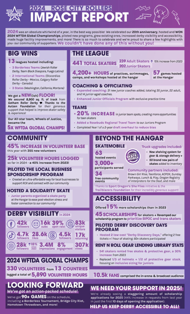 The Rose City Rollers mission is to serve women, girls, and gender-expansive individuals who want to play the team sport of roller derby, connect with an inclusive community, and realize their power both on skates and off.