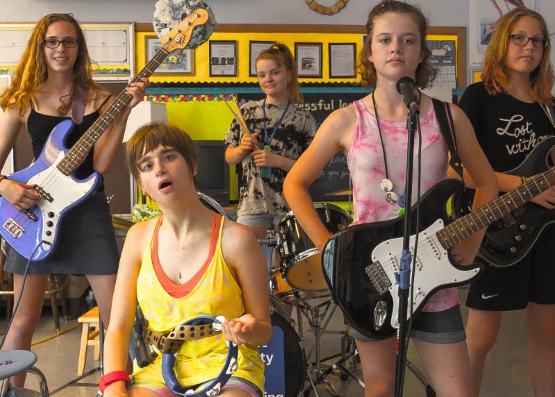 Waves of Haven”, a teen band from summer camp 2017, get their fierce band photos taken.