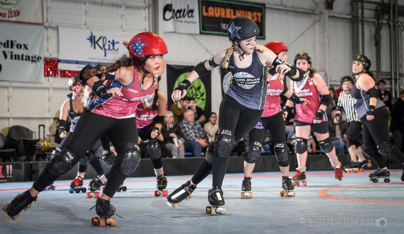 Gloria “Trixter” Bigback (left) jamming for the Little Red Riveters skirts the pack in bout against the Death Scar Derby Droids. Both are teams are part of RCR’s Junior Derby program, which serves youth athletes aged 7-17. Photography Credit: Regularman Photography