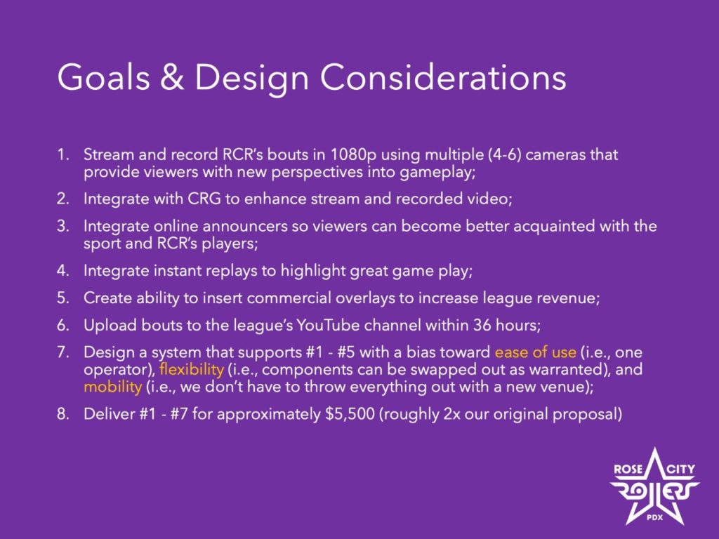 Our desire to improve how RCR streamed and recorded its bouts coincided with Chad of NERDerby’s excellent talk and description of resources on streaming (Part 1 and then if you want a more robust system Part 2).