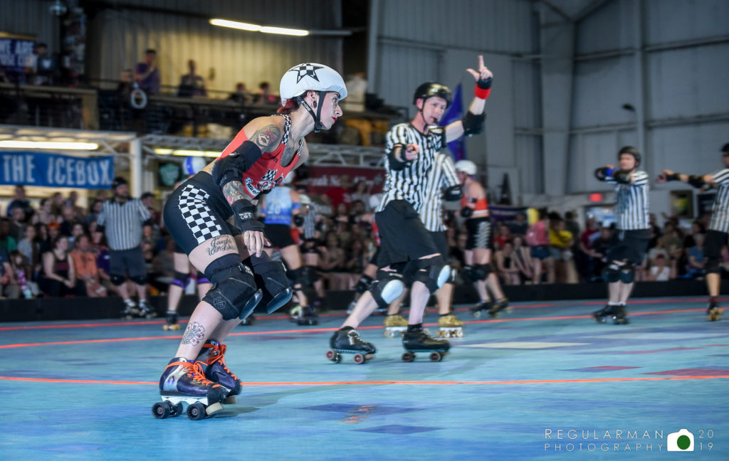 Little Red Ride-Her, who know skates under the name Carl, takes lead jammer during the Betties’ 2019 Home Team bout against the Heartless Heathers. (Photography Credit: Regularman Photography)