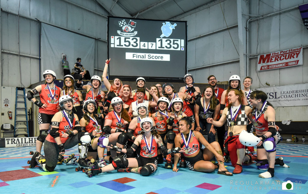The Break Neck Betties celebrate winning the 2019 Home Team Championship bout. (Photography Credit: Regularman Photography)