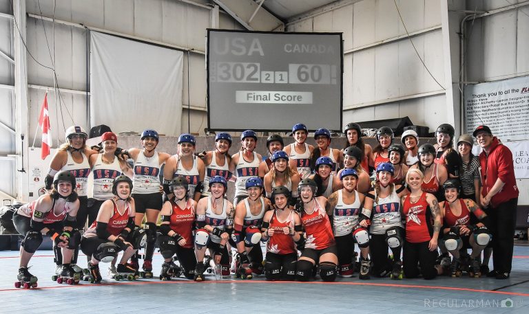 Team USA and Team Canada pose for a photograph after a bout at The Hangar in Portland, OR, last summer. (Photography Credit: Regularman Photography)